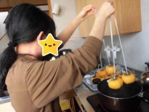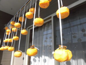柿に紐をつけてお湯にいれます。お風呂に入っているみたいですね(^^♪