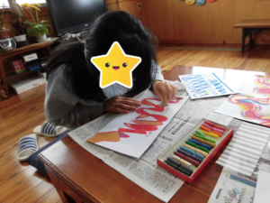 クレヨンで着色し始めるとアイデアが沸いて制作に集中していました。