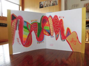 最初に赤色のアクリル絵の具で線を描き、金色も使いながら制作しました。