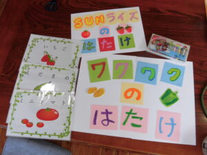 畑にはトマト🍅、ジャガイモ🥔、ピーマン、そら豆を植える予定です。色画用紙にクレヨンで一文字ずつ書きました。