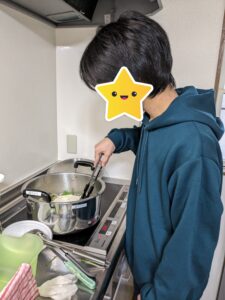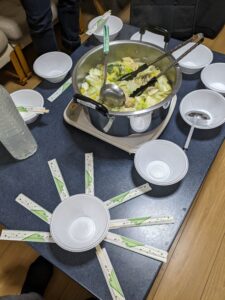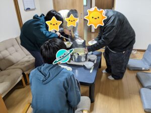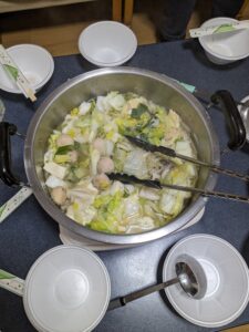 「もっとたべる?」とスタッフがきくと「もう食べれな~い💦」と言いながら首を横にふっていて、参加者みなさんはお腹がいっぱいのようでした。ボリューム満点のお鍋でした!