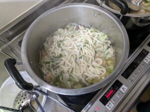 ごま豆乳鍋、地鶏昆布だしの2種類の鍋をつくりました。鍋が大きいのでみんなで具材を取りやすくていいですね!