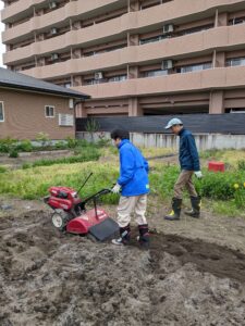 今年も耕運機を借りて畑を耕しました。1年ぶりに耕運機を触り動かすので利用者さんは不安そうでしたが、動かし始めると少しづつ感覚を思い出しているようで怖がらず耕してくれました👏✨畑を耕運機で1往復して次の人に代わり交代で何度か耕していると土がどんどん柔らかくなって足で踏むとふわふわになりとても気持ちよかったです。