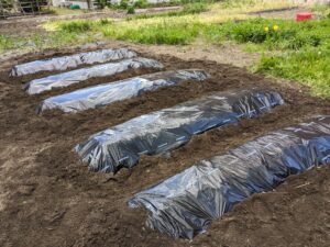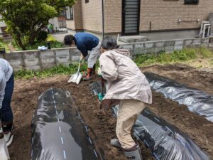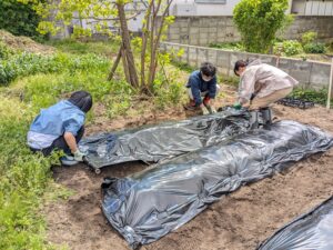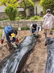 畝が出来た後、みんなで協力してマルチシートが飛ばされないように抑えながら杭を打って設置しました。
