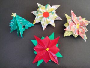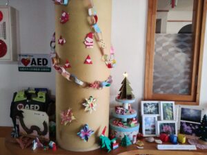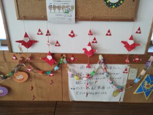 11月14日(水)15日(木)のSUNライズではクリスマスの飾りつけをしました。14日(水)は雨やどりの部屋の飾りつけと、ポインセチアの折り紙制作をしました。