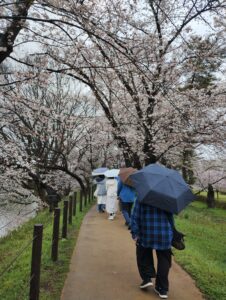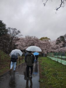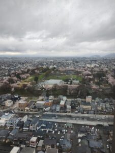 雨でしたが、満開の桜がとても綺麗でした🌸お花見後、みんなと合流してお団子を食べました。霞城セントラルの最上階の展望台にも行きました。