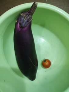 ミニトマトはプリッとして美味しそうです✨SUNライズで植えたナス🍆が大きく育っていました!(^^)