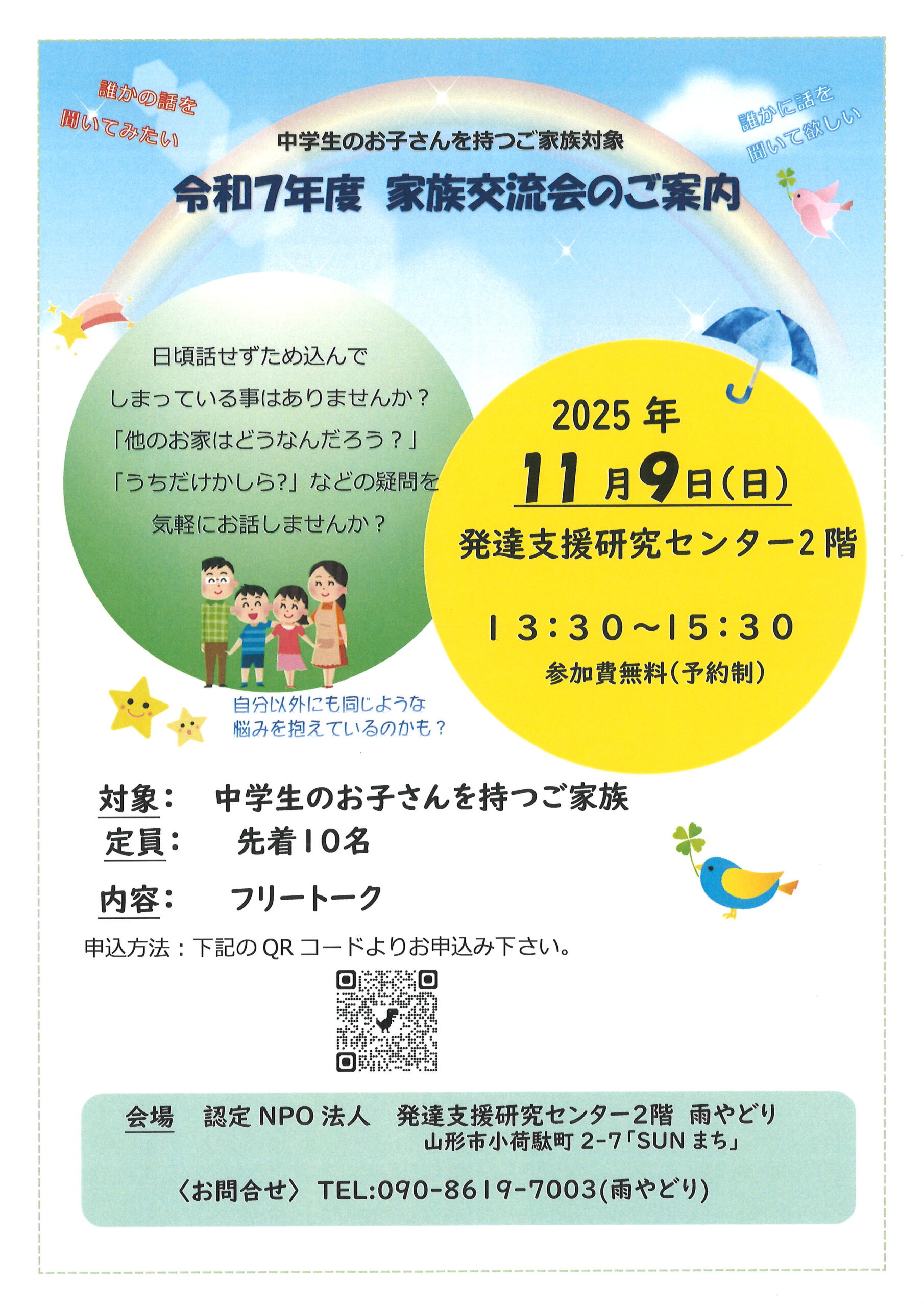 2025年11月9日(日)13時30~認定NPO法人発達支援研究センター2階雨やどりで中学生のお子さんを持つご家族対象の家族交流会を開催致します。