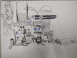 ↑こちらはイラスト初参加の利用者さんの作品になります。自宅と雨やどり(フリー)で描いた作品を持参して下さっていたので雨やどり(イラスト)に誘った所、参加して下さいました。初参加でしたが2時間集中して制作され「楽しかった!」と感想を教えてくれました。とても魅力的な描き方で実際近くで見て頂きたい作品です。デコトラに対する愛着をとても感じます✨クレヨンしんちゃんのイラストも見せて下さいました(^^♪