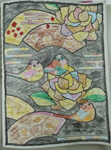 ↑毎月雨やどり(イラスト)に参加して、色鉛筆・シャープペン・ペン・筆ペンなど様々な画材を工夫して使い制作されています。毎月作品を見せて貰っている職員は魅力的な塗り方に「凄い!どうやって塗ったの?」「綺麗だね✨👏」といつも感動しています。今月は金色、黒を使った渋く秋の夜を感じる作品になりました👏