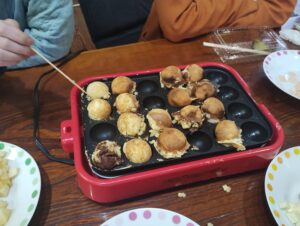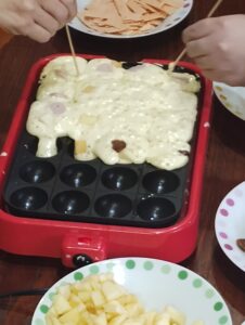 今年もたこ焼き機を使ってボールケーキを作りました。材料を切ることから始めました。包丁が初めての方はピーラーで皮をむきました🍎