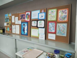 会場内は対話テーマ別の机を用意して雨やどりの利用者さんが制作した作品も展示しました。尾花沢市の雨やどり利用者さんが制作した作品を持参して下さったので、その作品も展示しました。