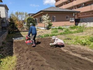 2日目は畑に石灰、肥料を巻いて耕運機で耕しました。耕運機が初体験の方もいましいたが、少し耕すことができました。
