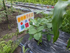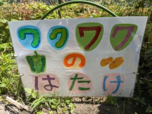 かわいい手づくり看板ができたので設置に畑に行くと野菜の苗がよく育っていていました🍅